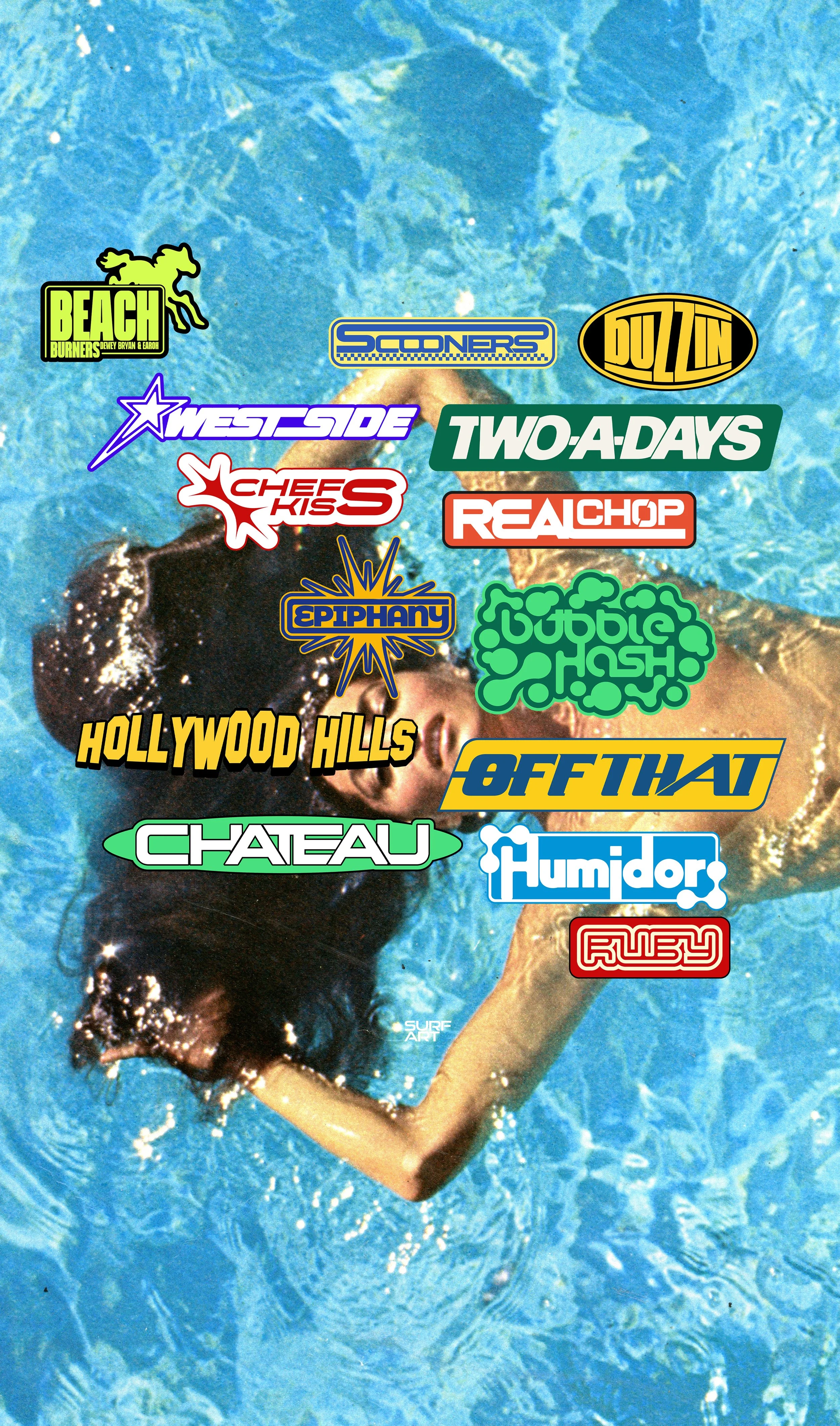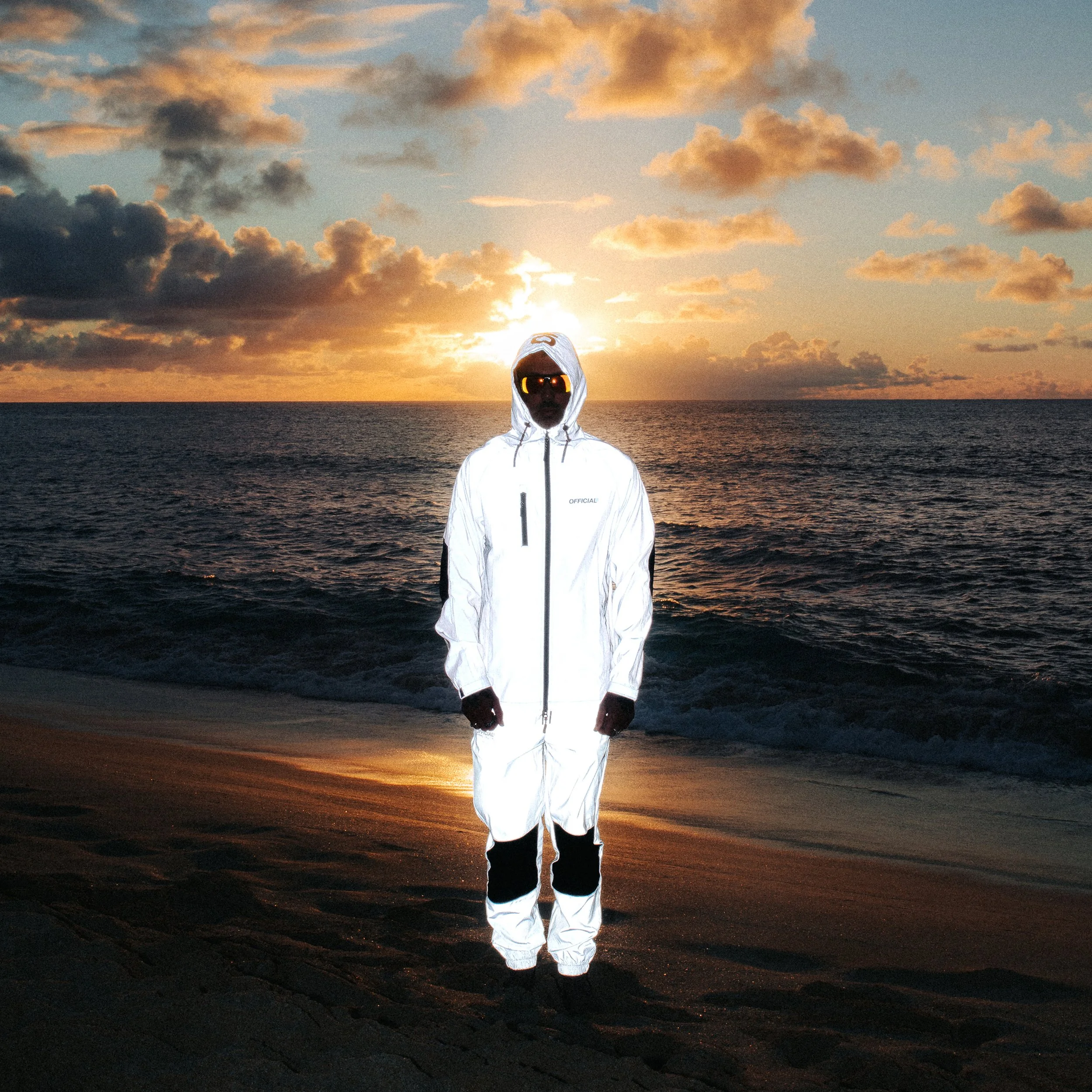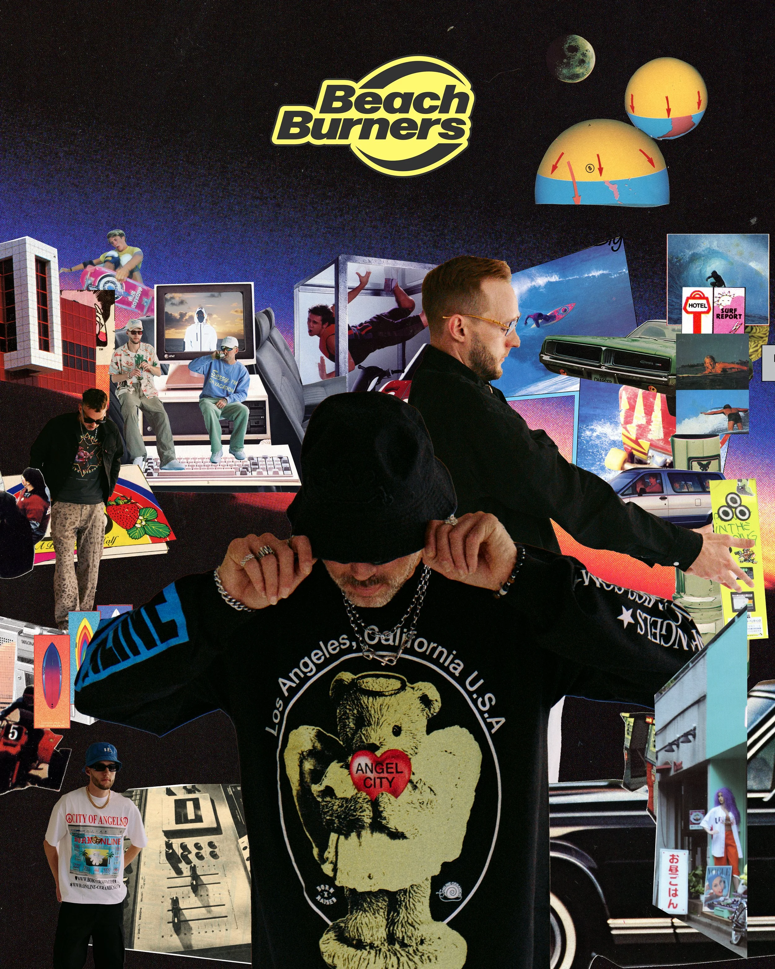 The visual identity for Beach Burners draws from vintage surf magazines and outlaw cinema, translating those references into a cohesive design system. Reflective suit portraits against sunset coastlines established the album’s mythic, futuristic protagonist, while a custom typographic system gave each track its own surf-inspired logo, functioning collectively as a sticker pack. Collaged ephemera — including parody Japanese radio ads, mock surf magazine covers, and sticker-bombed vehicles — expanded the world beyond the album, while merchandise, zines, and event collateral extended the brand into physical space. Together, these elements created a layered identity that blurred the line between record release and lifestyle brand.